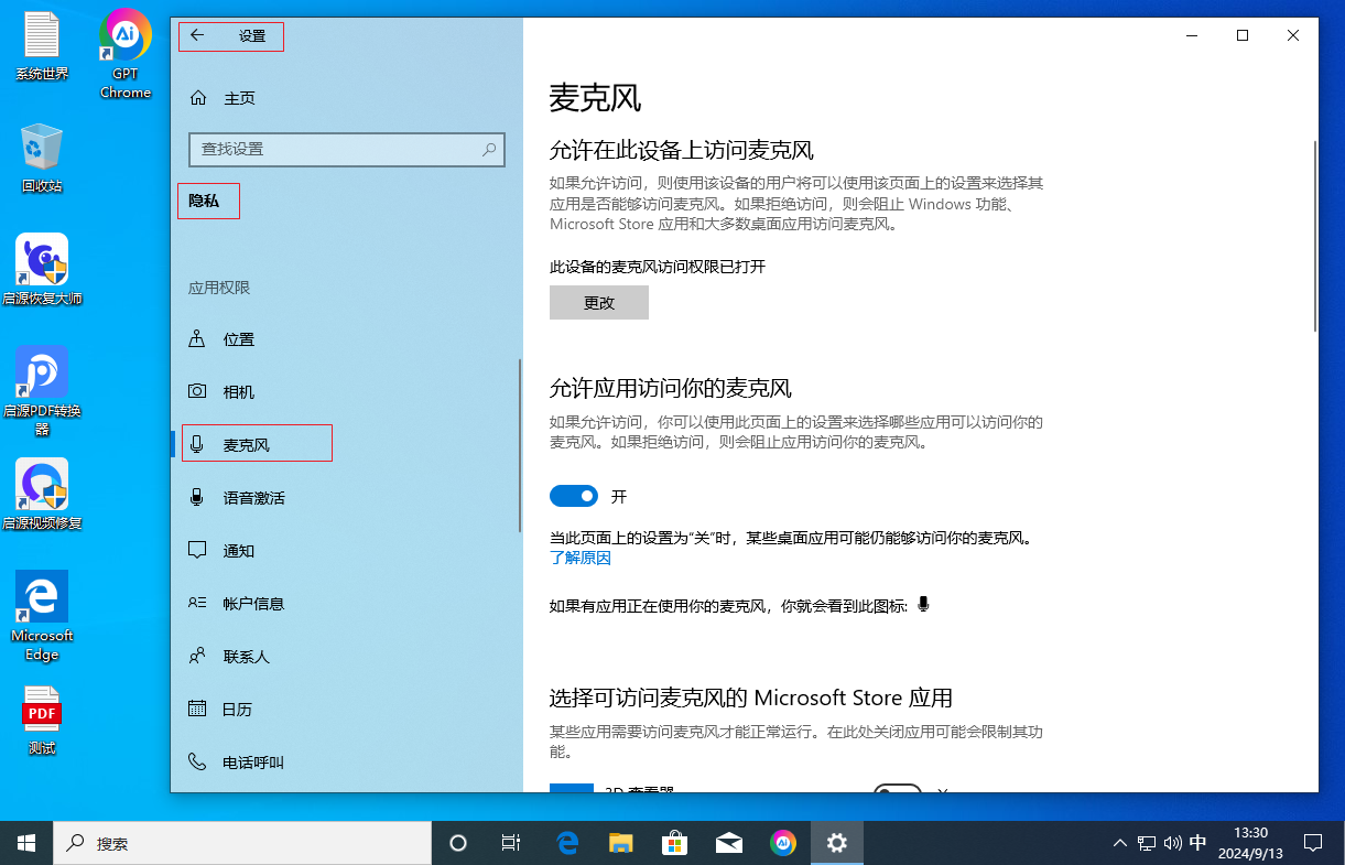 操作路径:打开 设置 > 隐私和安全性 > 麦克风。