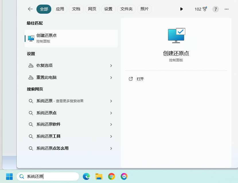 1.按下Windows键,输入“创建还原点”,选择“系统还原”。